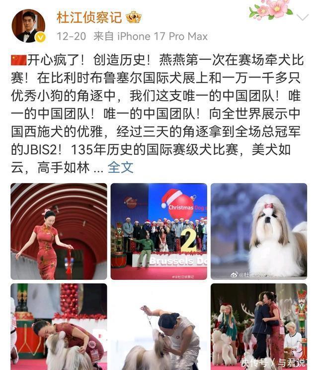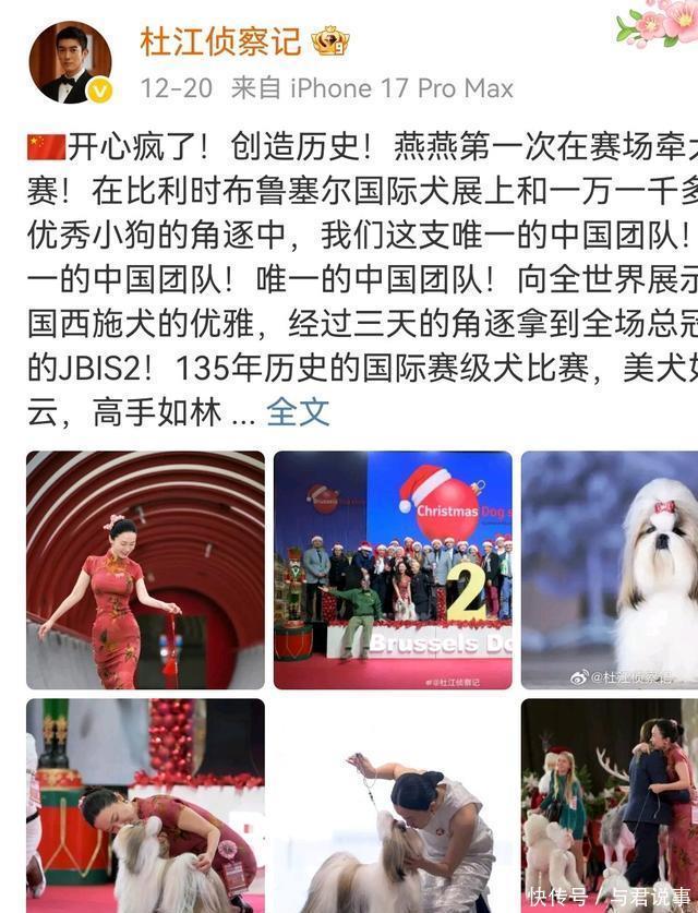 12月20日晚,她在比利时布鲁塞尔国际犬展上的夺冠消息刷爆热搜,连老公杜江都激动到连发三条“唯一的中国团队”,这波操作简直让网友直呼“太会了”!